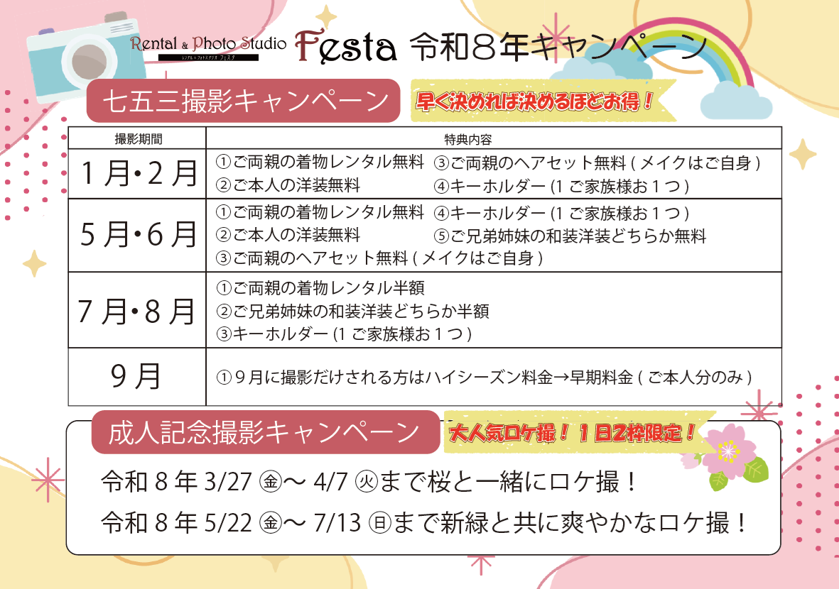 2026年、最高の一枚を。 七五三&成人記念キャンペーン解禁! 「早撮り」と「ロケ撮」で、賢く・おしゃれに思い出作り。 📸 七五三キャンペーン \早く撮るほど、圧倒的にお得!/ 「混み合う時期を避けたい」「家族 […]