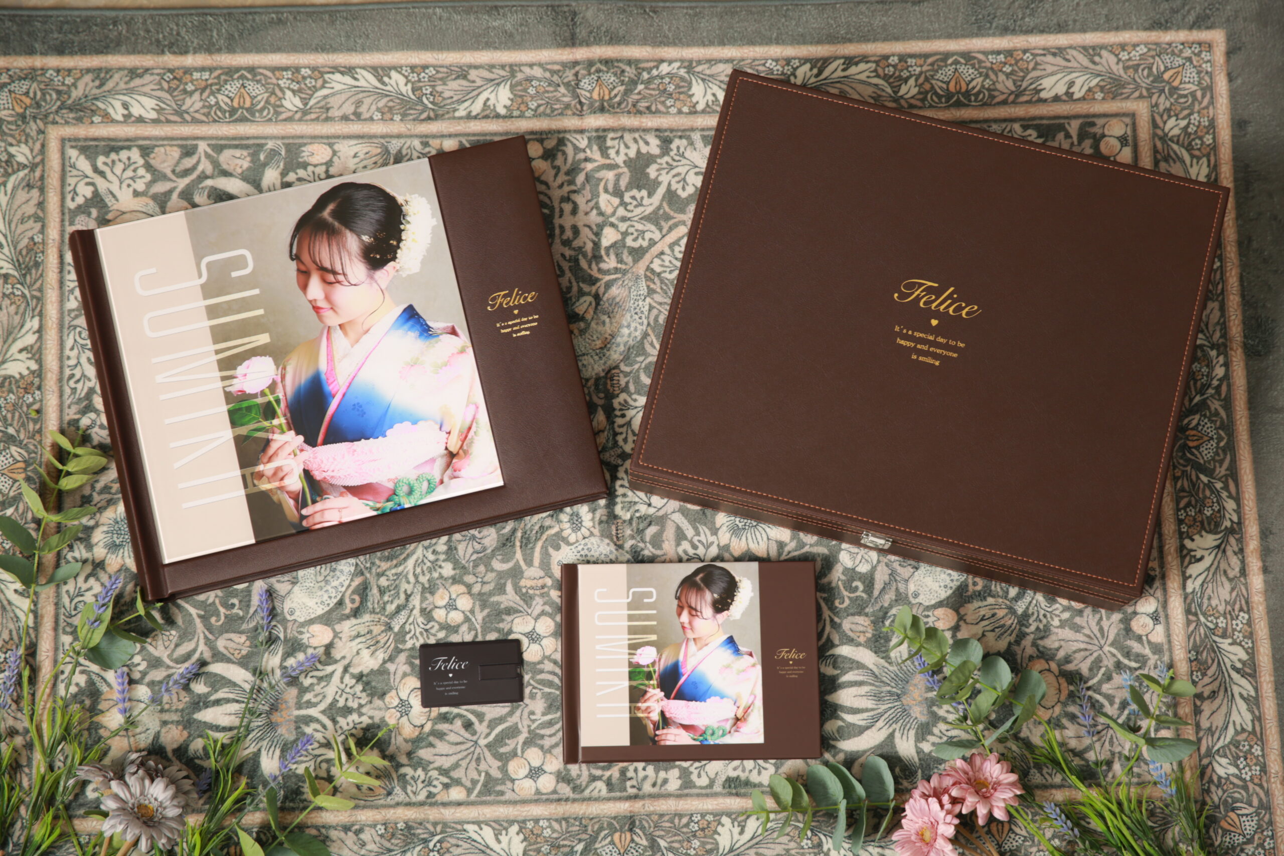フェリーチェ 275,000円 ・16P45C ・サイズ:310(H)×385(W) ・表紙仕様:レザー・アクリル ・表紙カラー:ホワイト/ブラック/ブラウン ※ミニアルバム付(サイズ:162(H)×210(W)) ※専用ボックス(2層仕立てレザーケース)付 ※全データ(USBメモリーカード)付 シェリール 198,000円 ・18P36C ・表紙仕様:レザー ・表紙カラー:ホワイト/くすみピンク/ペールカーキ ・サイズ:300(H)×210(W) ※専用ボックス(アルバムスタンドボックス)付 ※全データ付 アクア 143,000円 ・14P27C ・表紙仕様:アクリル(裏表紙共に) ・サイズ:297(H)×210(W) ※アルバムデータ(27C)付 ※全データ追加20,000円 カラーコレクション 122,100円 ・10P17C ・表紙仕様:アクリル&布生地 ・表紙カラー:ホワイト/ブラック/ピンク/イエロー/ブルー ・サイズ:250(H)×250(W) ※カラーパーツはお好みで入れ替え可能 ※アルバムデータ(17C)付 ※全データ追加20,000円 シャイン 96,800円 ・8P13C ・表紙仕様:アクリル(裏表紙レザー) ・裏表紙カラー:ブラック/ホワイト ・サイズ:297(H)×210(W) ※全データ追加35,000円 ※アルバムデータ(13C)のみ追加も可能 ガレット+ 70,400円 ・3面9C ・表紙仕様:アクリル&レザー ・表紙カラー:ホワイト/ブラウン/くすみピンク/モスグリーン ・サイズ:350(H)×250(W) ※全データ追加40,000円 ※アルバムデータ(9C)のみ追加も可能 COLORFUL 52,800円 ・表紙カラー:48色+2色 ・サイズ:245(H)×245(W) ※表紙と裏表紙の組み合わせパターン2400通り ディスクブック(撮影全データ) 99,000円 ・表紙カラー:北欧柄赤/北欧柄青/ストライプイエロー/ストライプパープル/ダークブラウン ・サイズ:265(H)×190(W) ●2面2C ●専用ディスクブック付 ●CD-Rにて納品 ※全データご購入の場合、主役となる方がお一方追加につき追加料金20,000円頂戴いたします。 コフレ(撮影全データ) 101,000円 ●2面2C ●専用スタンド付 ●USB(3way*)にて納品 *対応コネクタ:Type-A/Type-C/Lightning ※全データご購入の場合、主役となる方がお一方追加につき追加料金20,000円頂戴いたします。 Flow